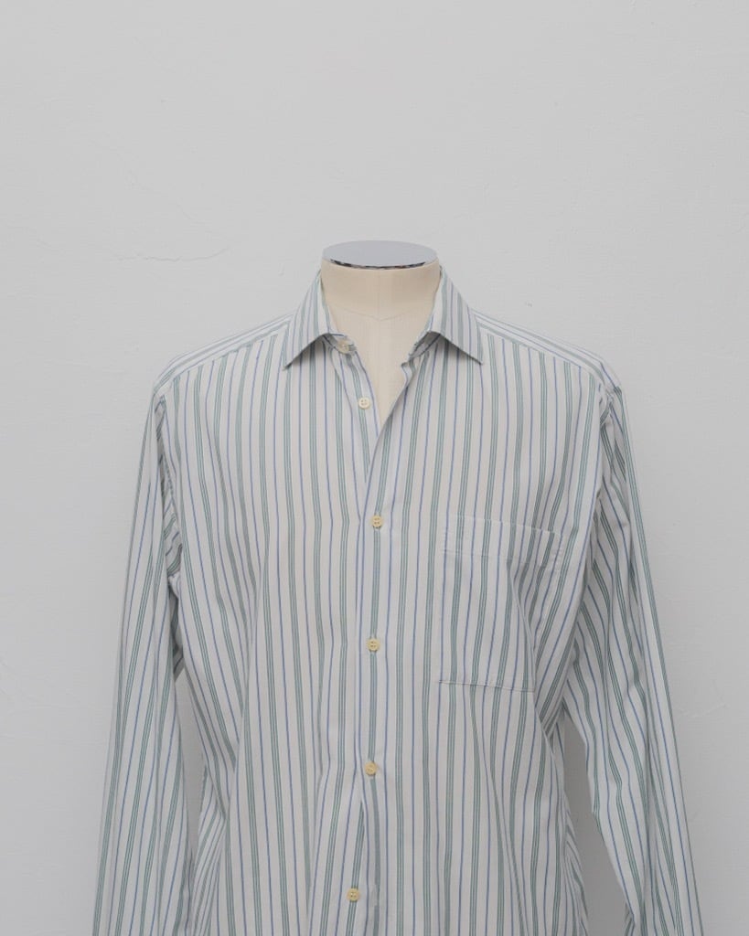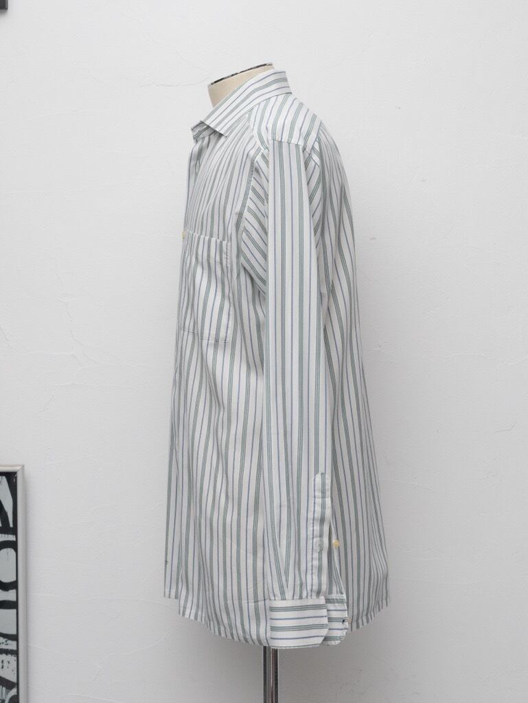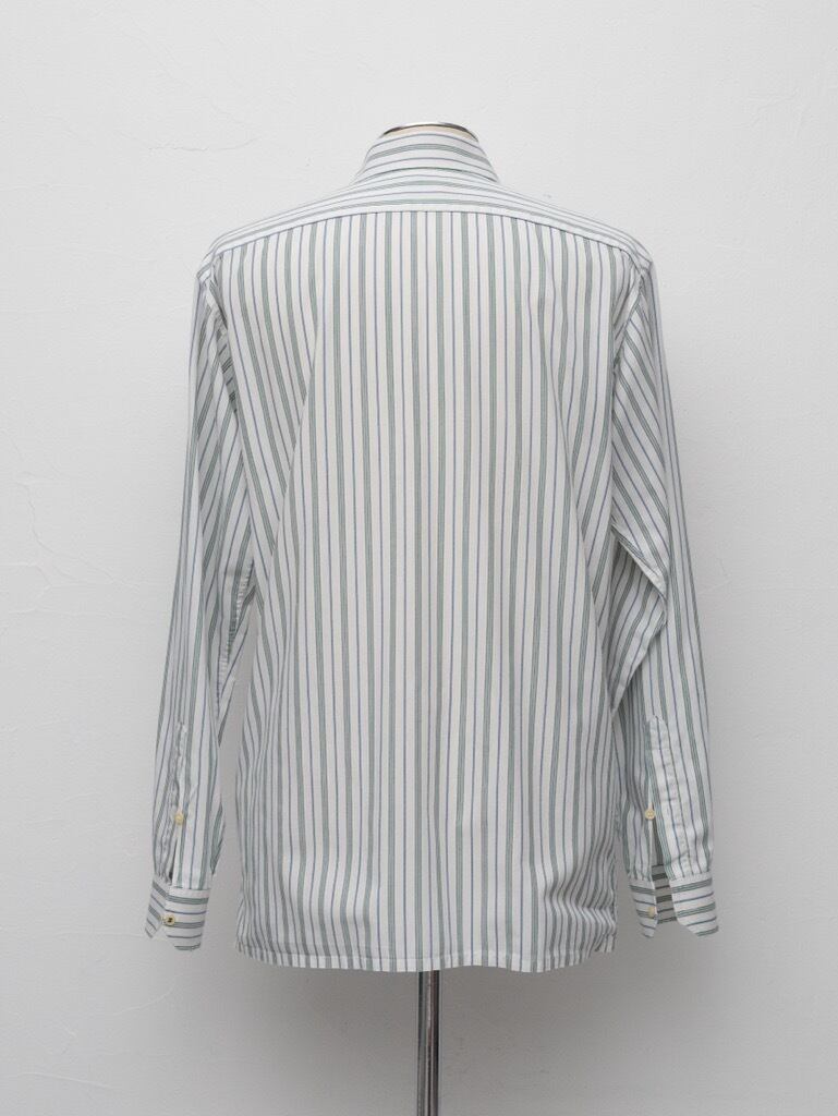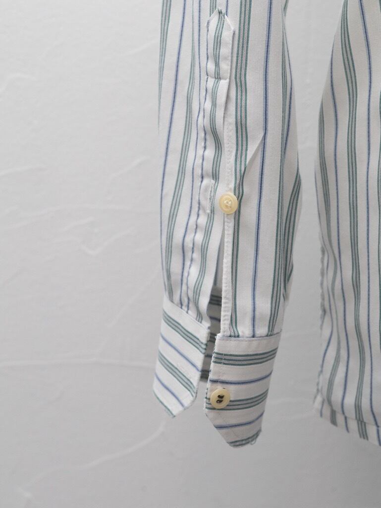 グリーンストライプに襟はややワイドでラフに着ても、タイアップどちらもおすすめです。