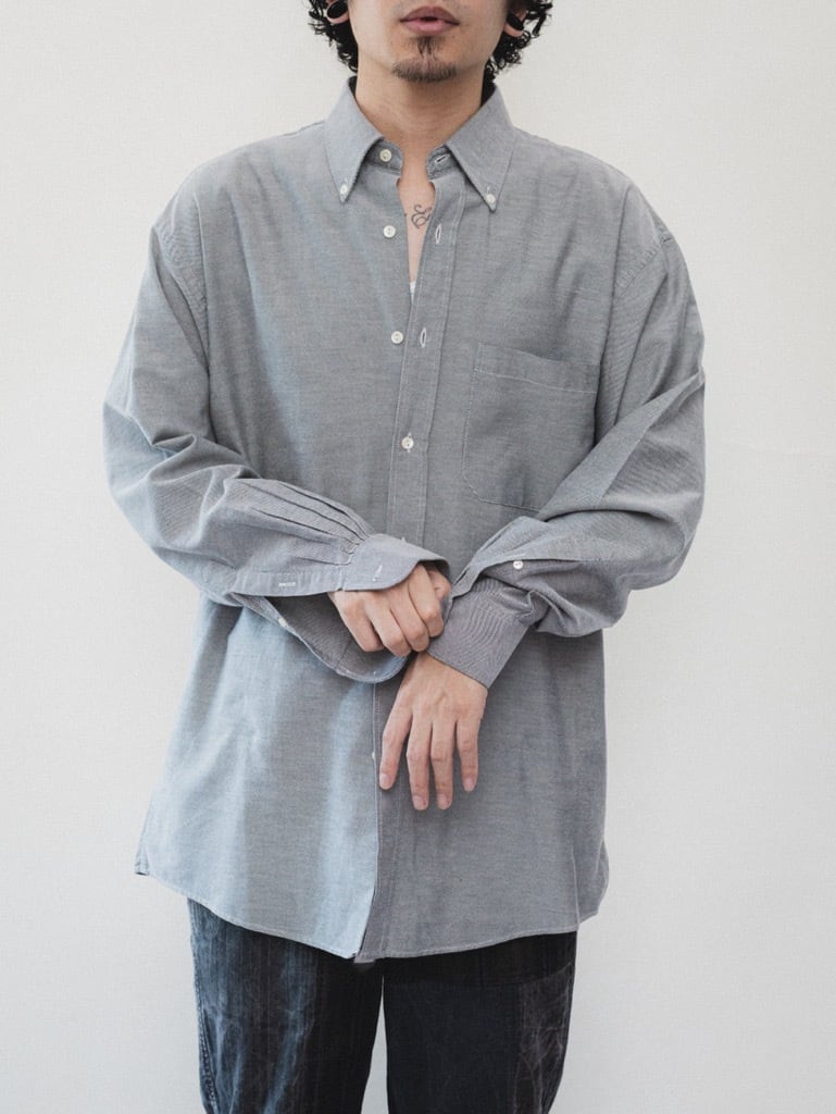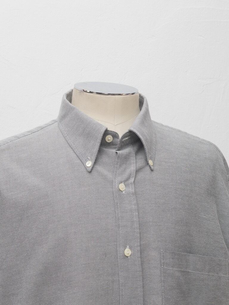ボタンダウンタイプの襟。襟はややシャープで収まりの良いシルエット。