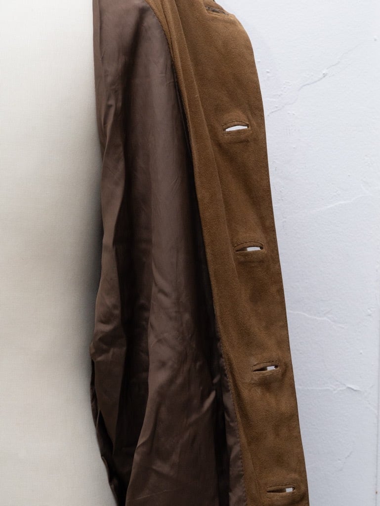 控えめなトーンながら確かな存在感を放つ、柔らかなスウェードレザー。わずかにくすんだトーンのリブが全体のバランスを引き締め、ボタンフライ仕様が持つ端正さがスポーティな要素を上品に昇華している。