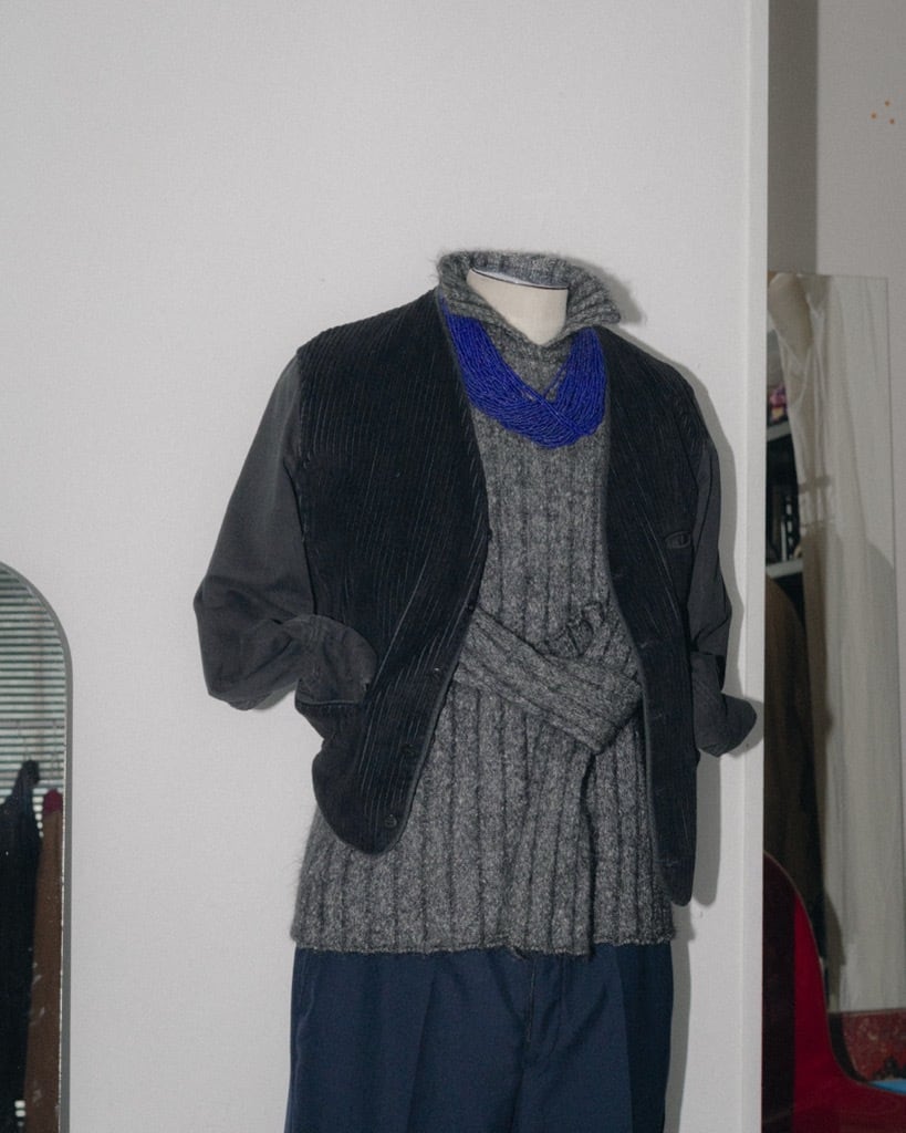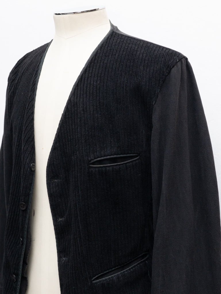 コーデュロイとコットン生地のコンビネーション。フロントにはパイピング。