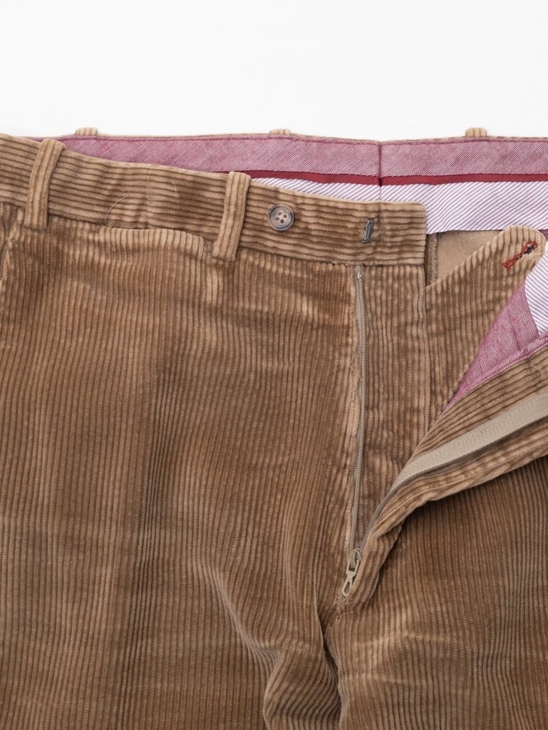 素材には英国・Brisbane Moss(ブリスベイン・モス) 社製の太畝コーデュロイを採用。手に取るとわかる重みとしなやかさの共存している。