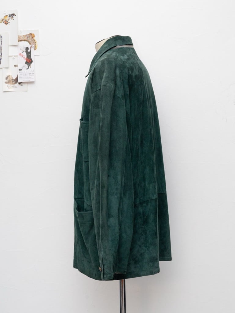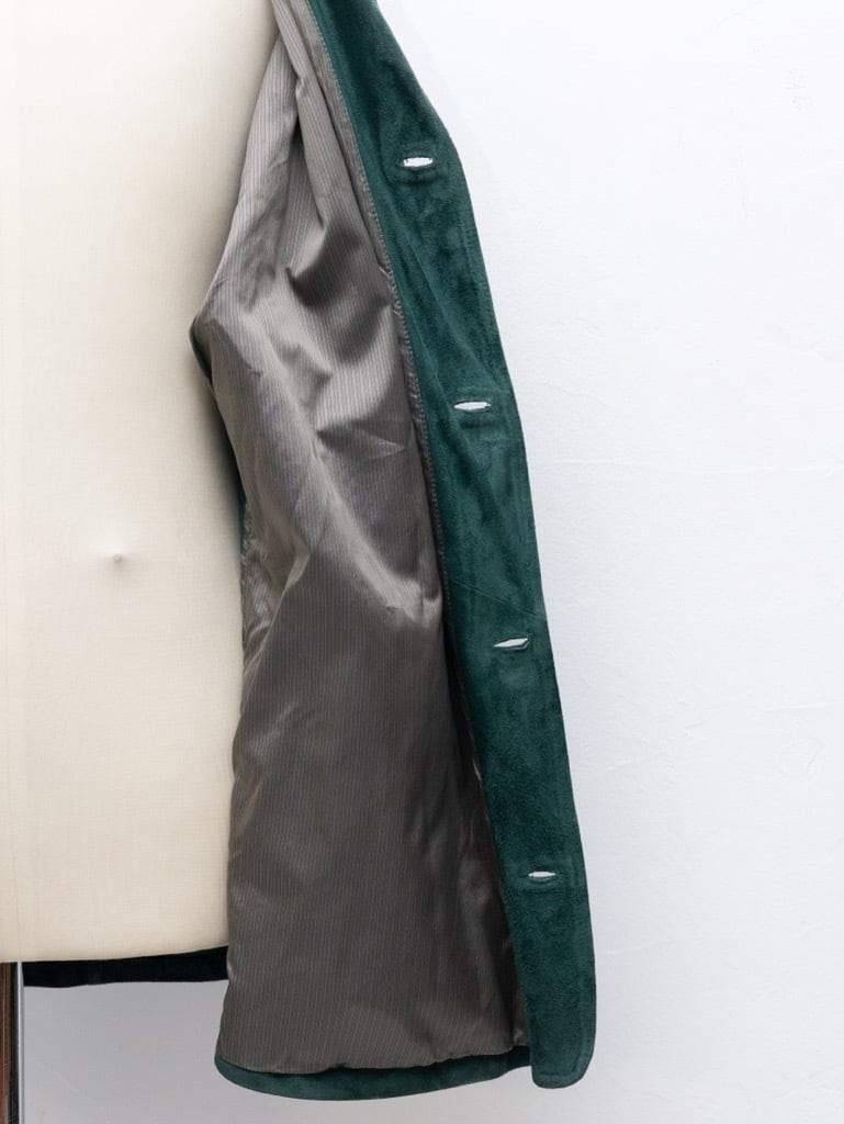 深みのあるビリジアングリーンのスエードレザーは、革の柔らかさと滑らかさは触れた瞬間にその品質を物語る。