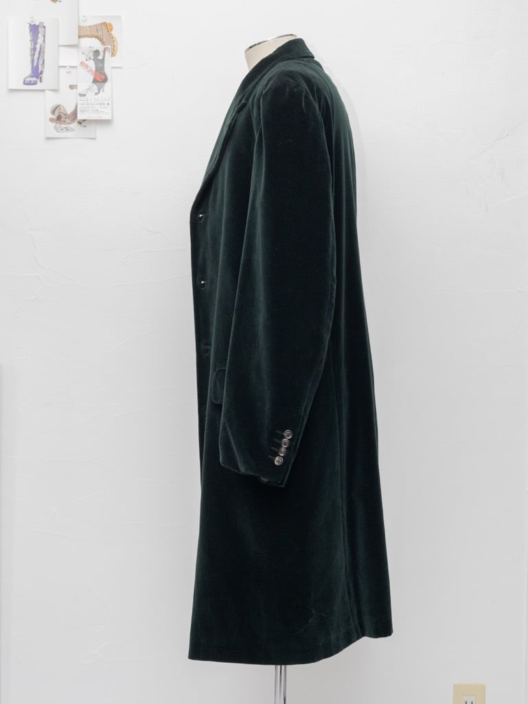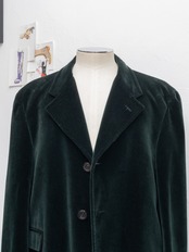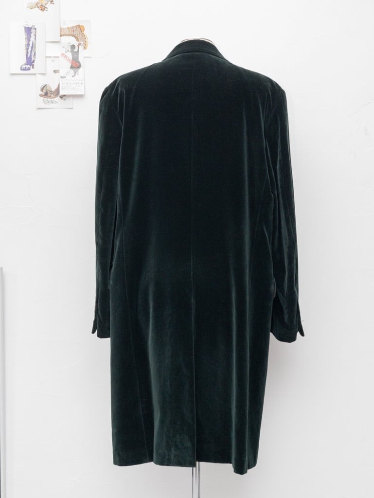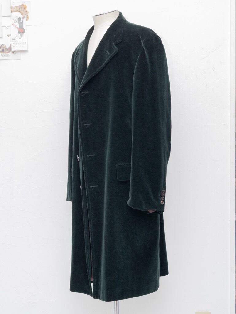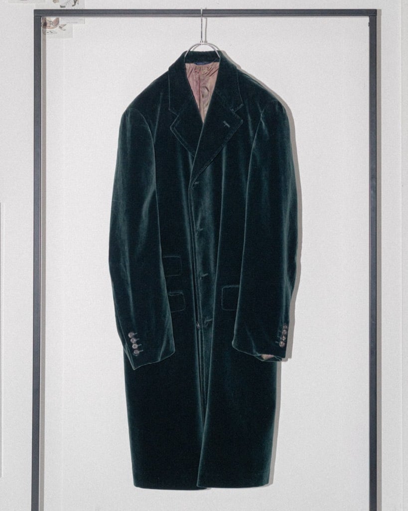 チェスターコートとベルベットとの重厚な雰囲気に対して、肩パッドは付属せず袖口も柔らかな仕上げになっており、程よく肩の力が抜けている。