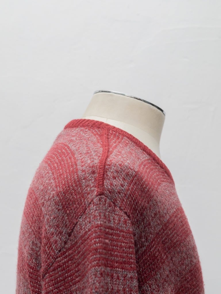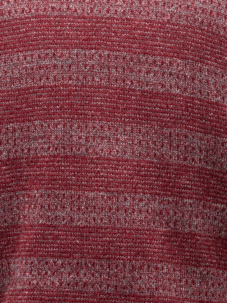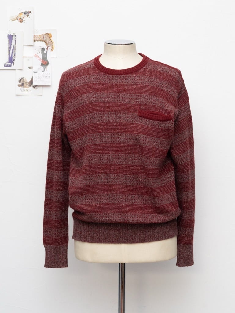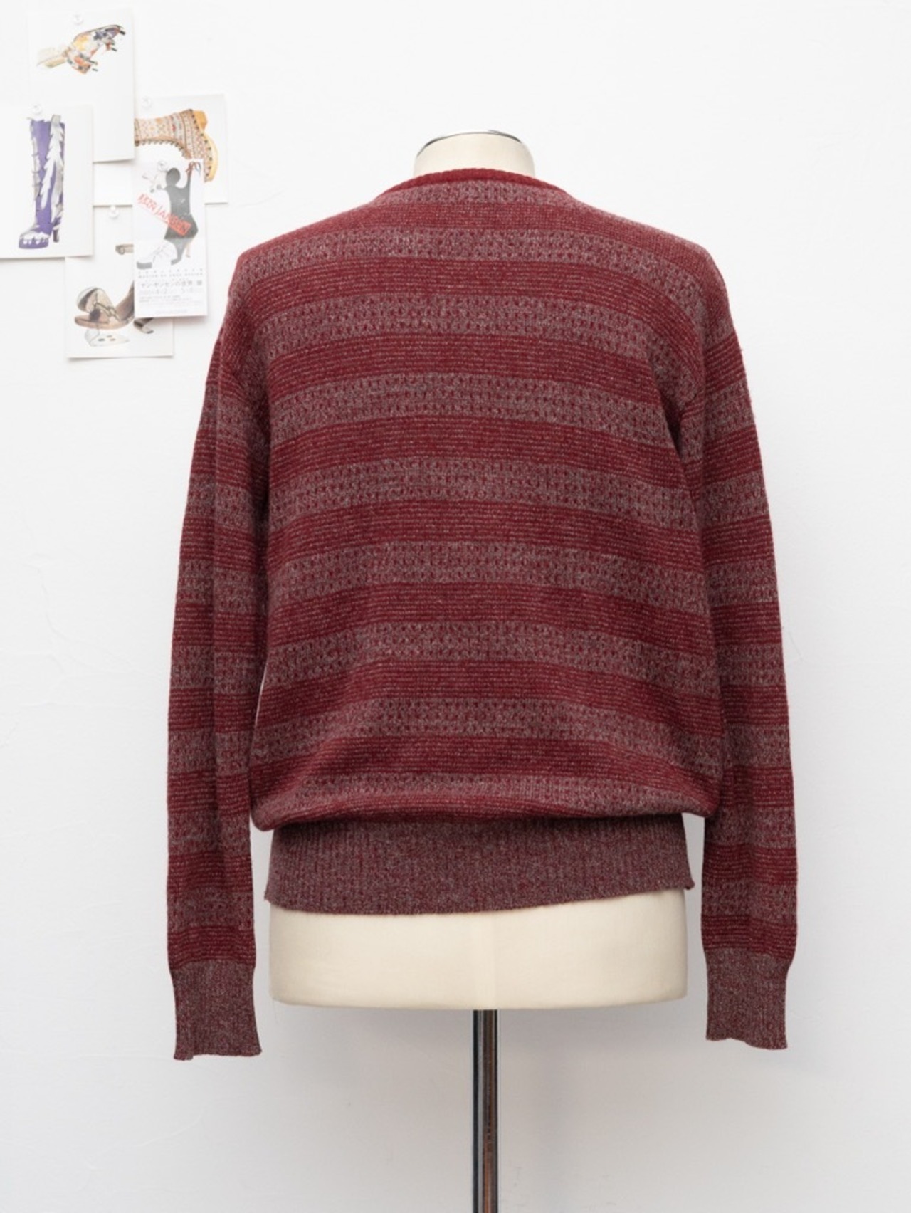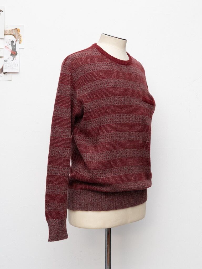 マルーンカラーがベースのメランジ調ボーダーは、ラフなタッチと毛足のある繊維が混ざったニット。