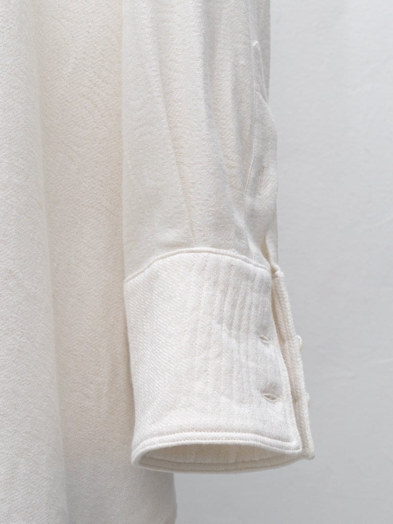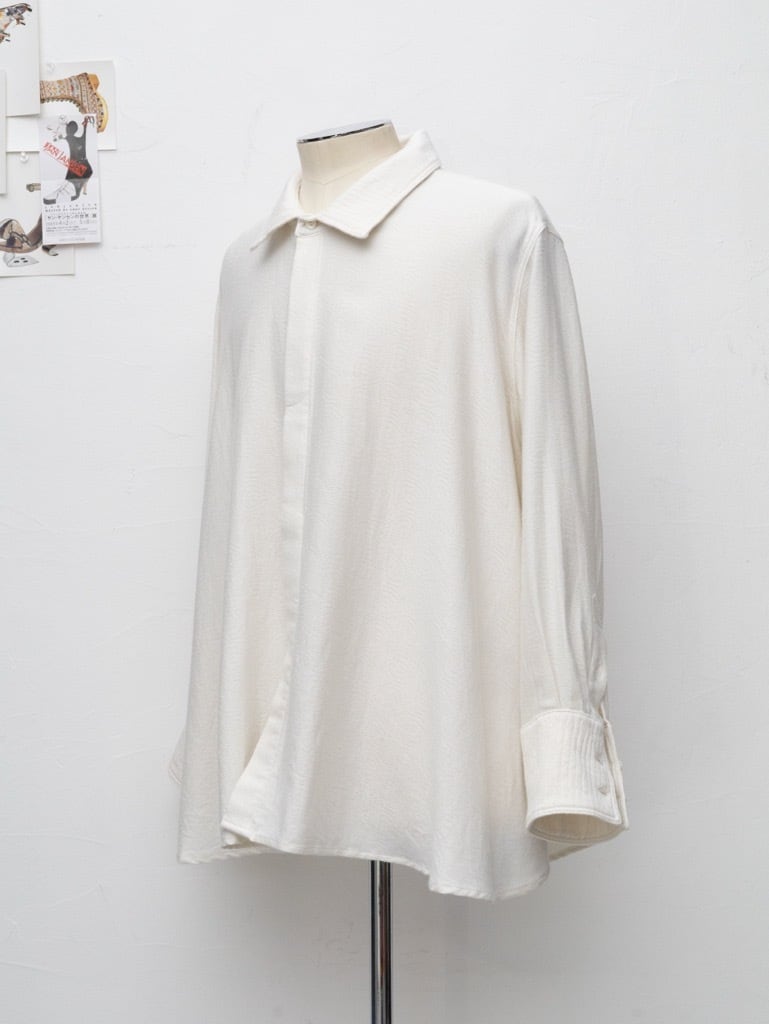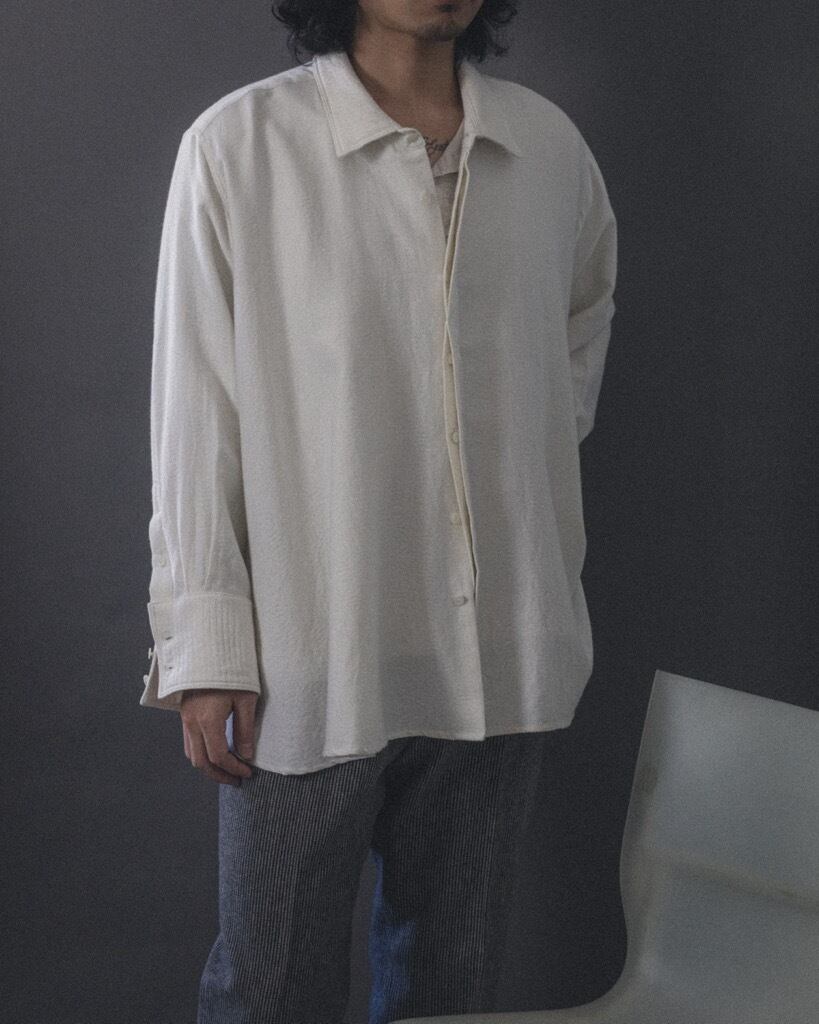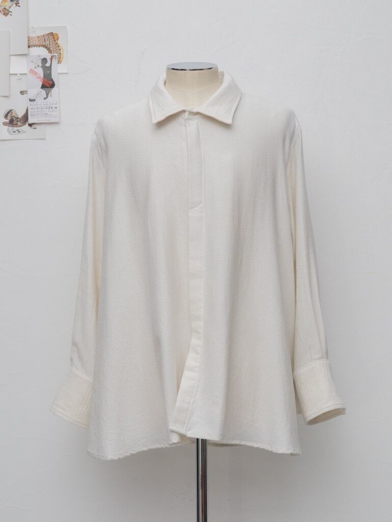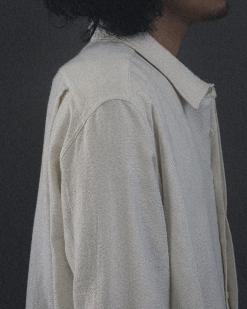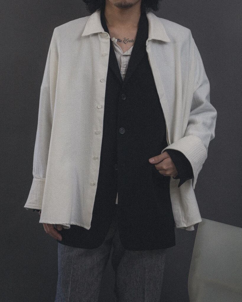 シャツをベースにし、体に衣服を合わせて袖や身頃のゆとりに変化を加えた。