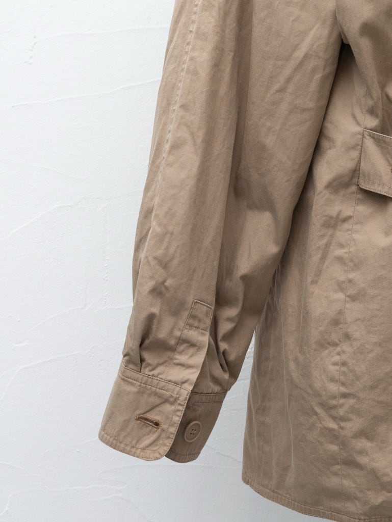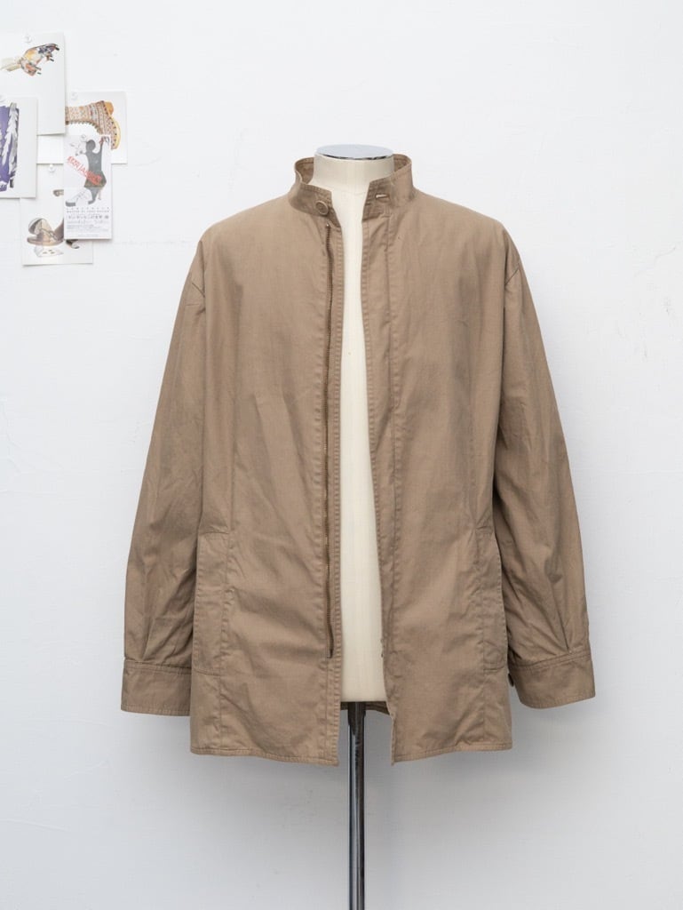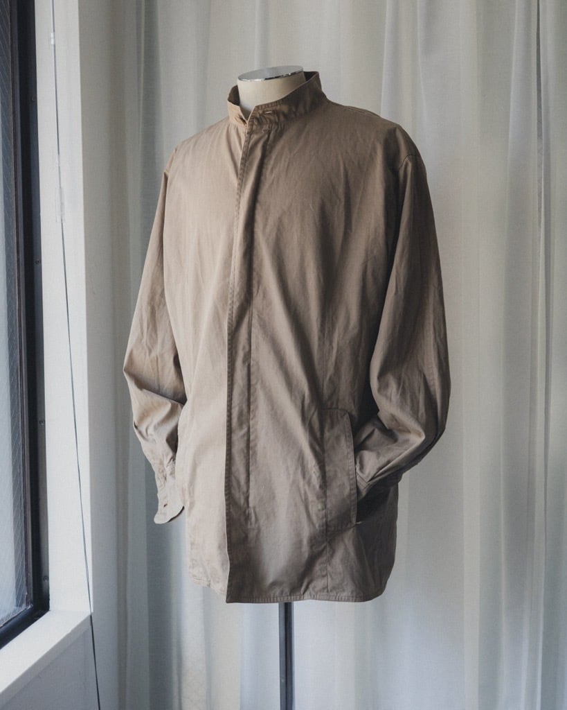 スタンドカラー、フロントは比翼仕立てのミニマルでソリッドなデザイン。