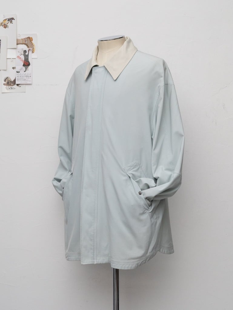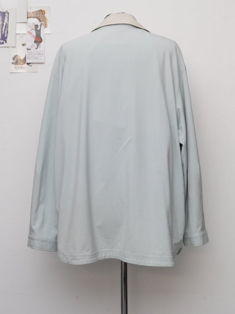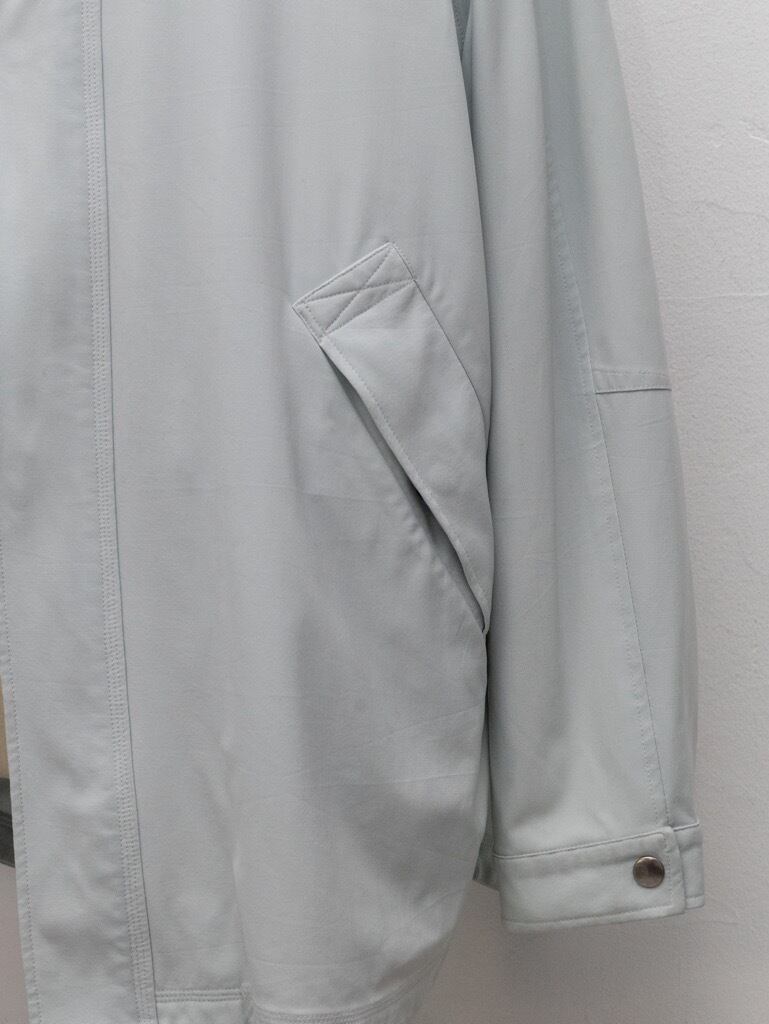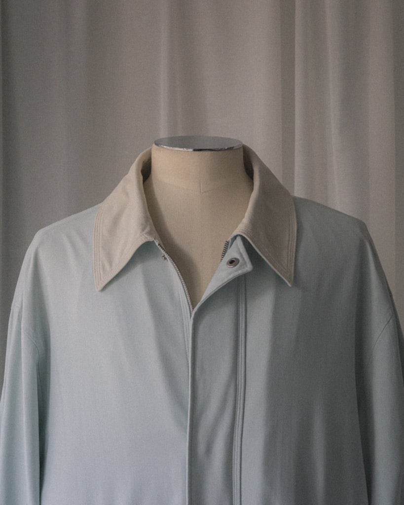 柔らかなペールブルーのナイロンはサラッとしたタッチ。オフホワイトの襟と裏地はややストレッチの効いた生地。