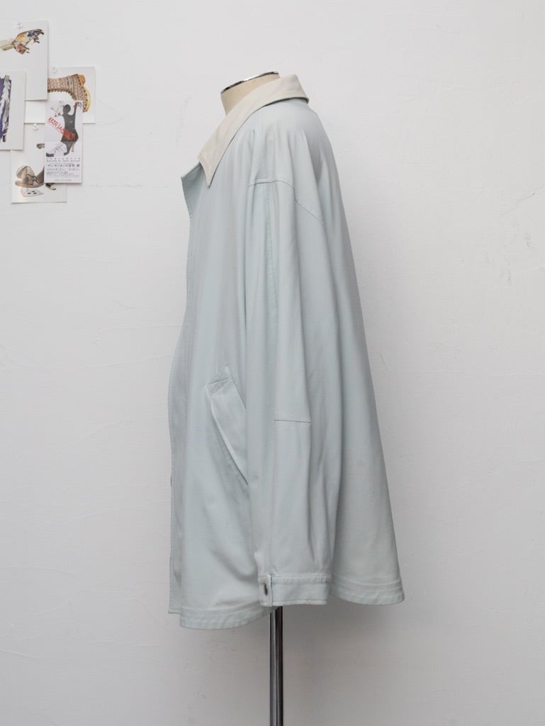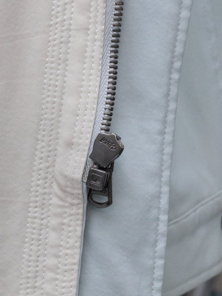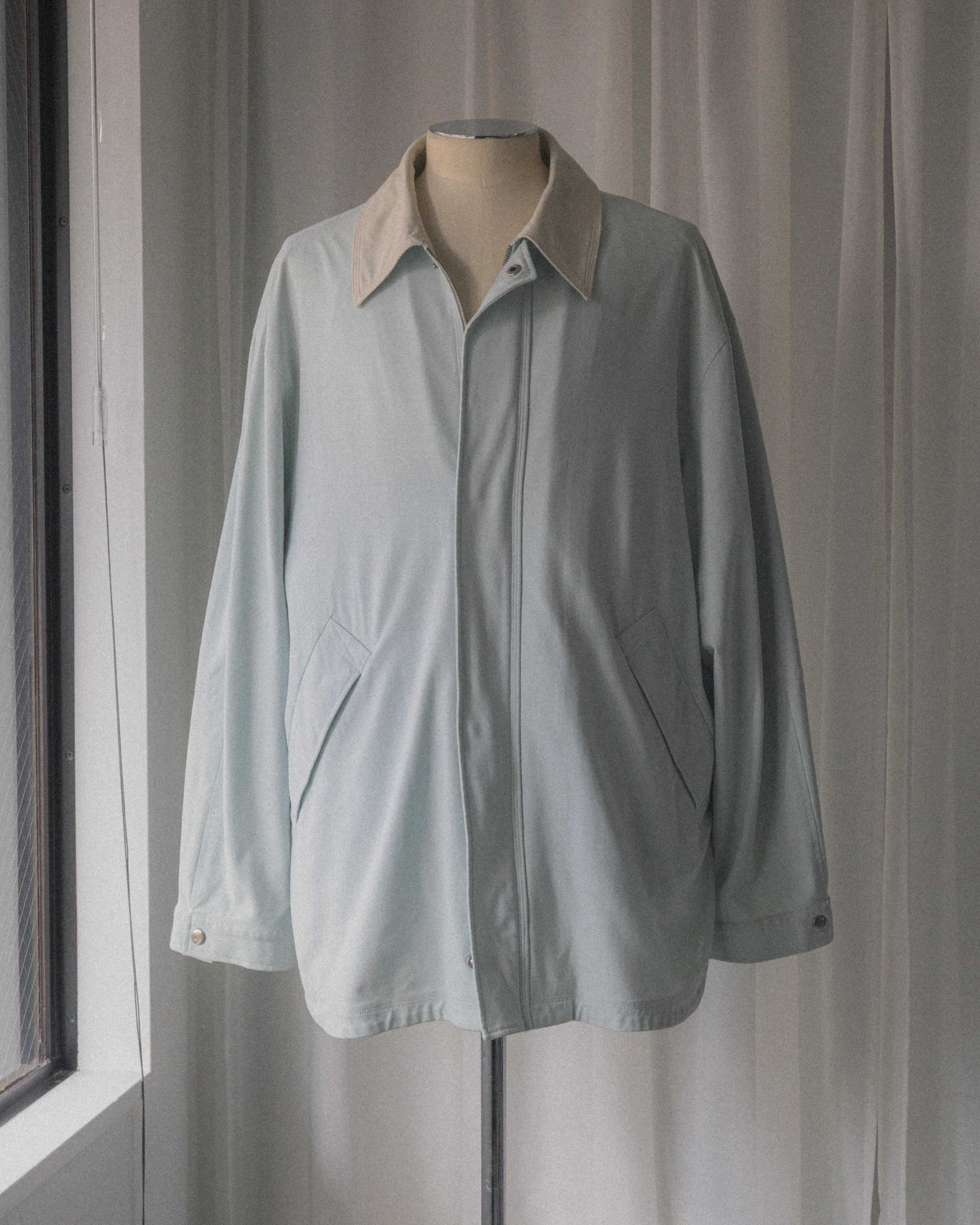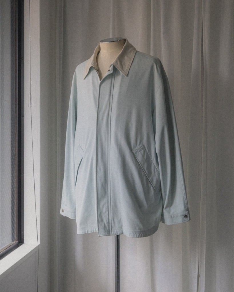 柔らかなペールブルーのナイロンはサラッとしたタッチ。オフホワイトの襟と裏地はややストレッチの効いた生地。