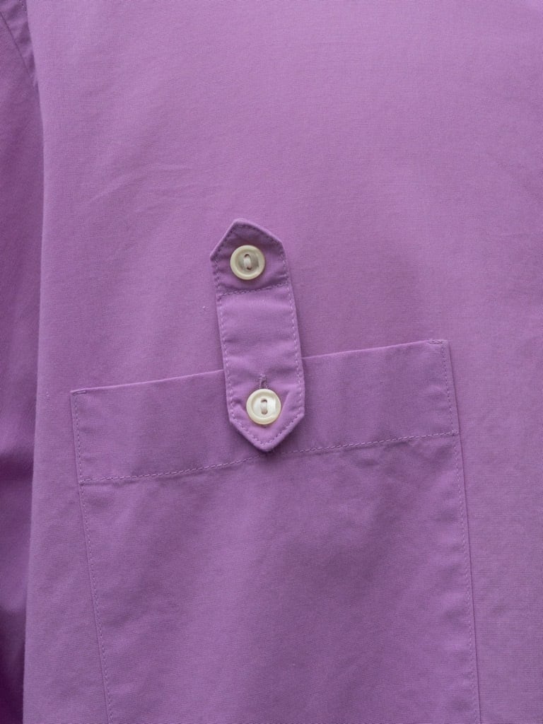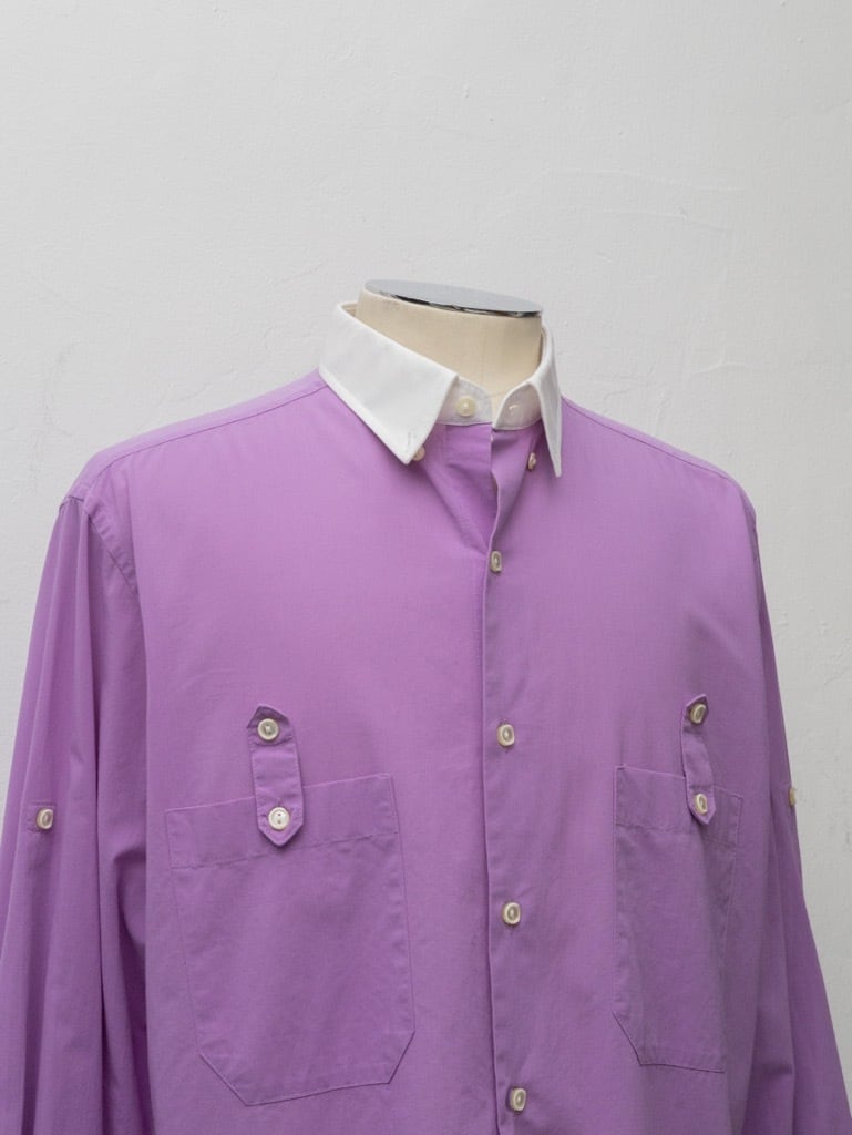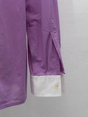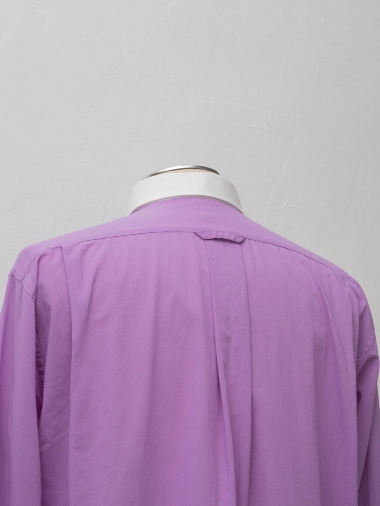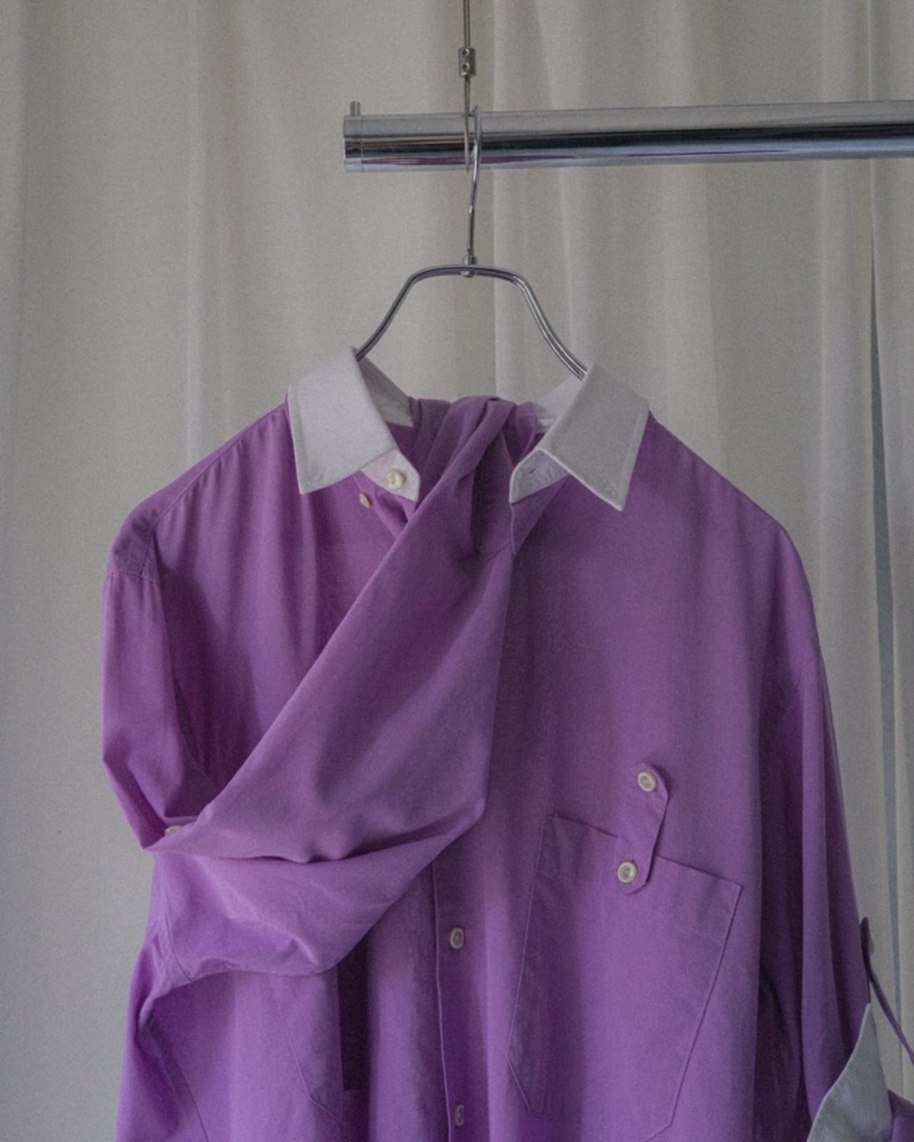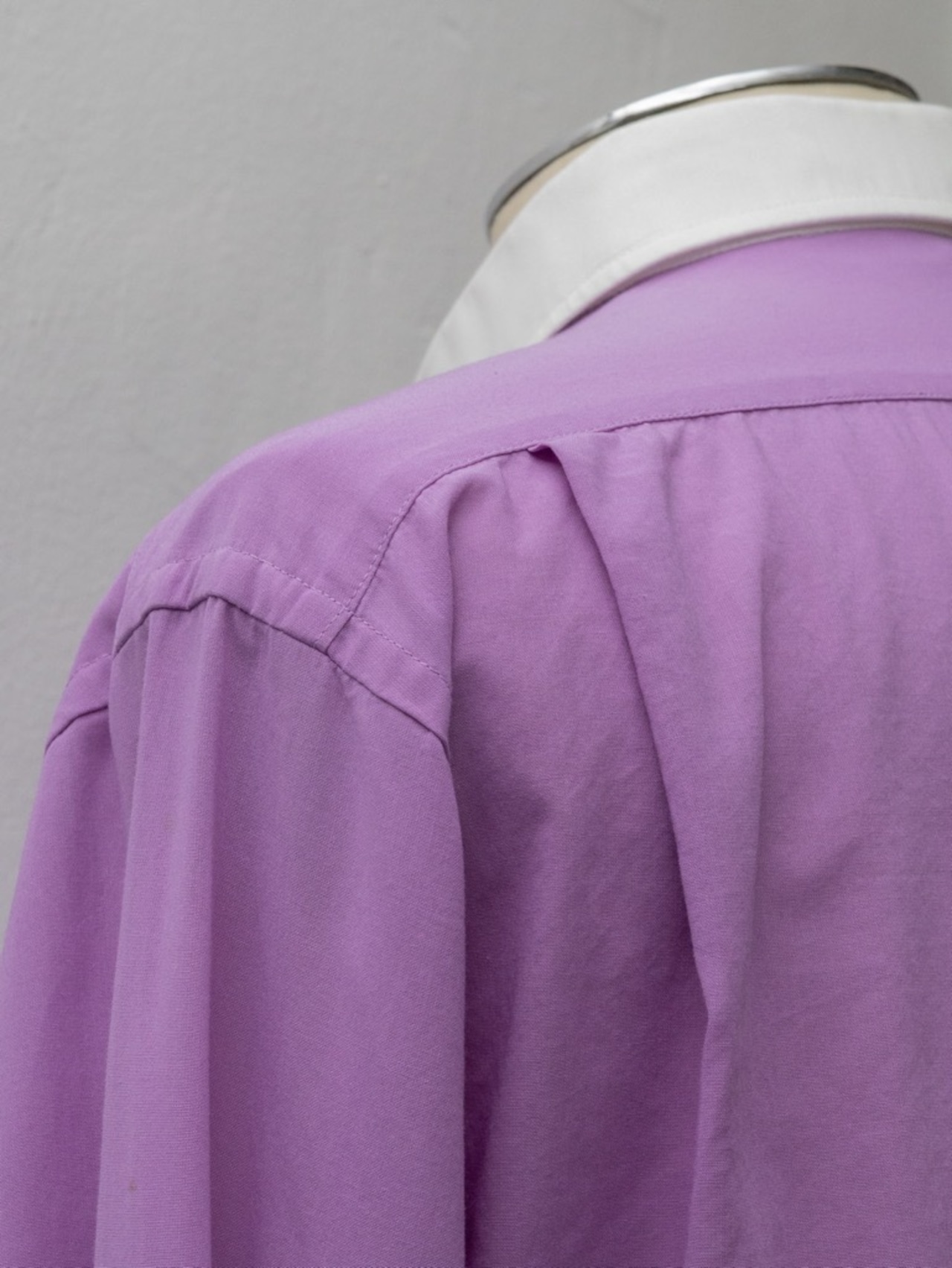 ややくすみのあるピンクパープルのボディと、白い襟のコントラストは、代表的なPIERRE CARDINのクリエイションの一つでもあるコスモコールを彷彿とさせる力強いカラーパレット。