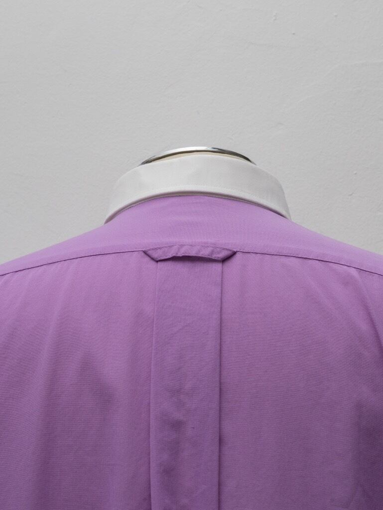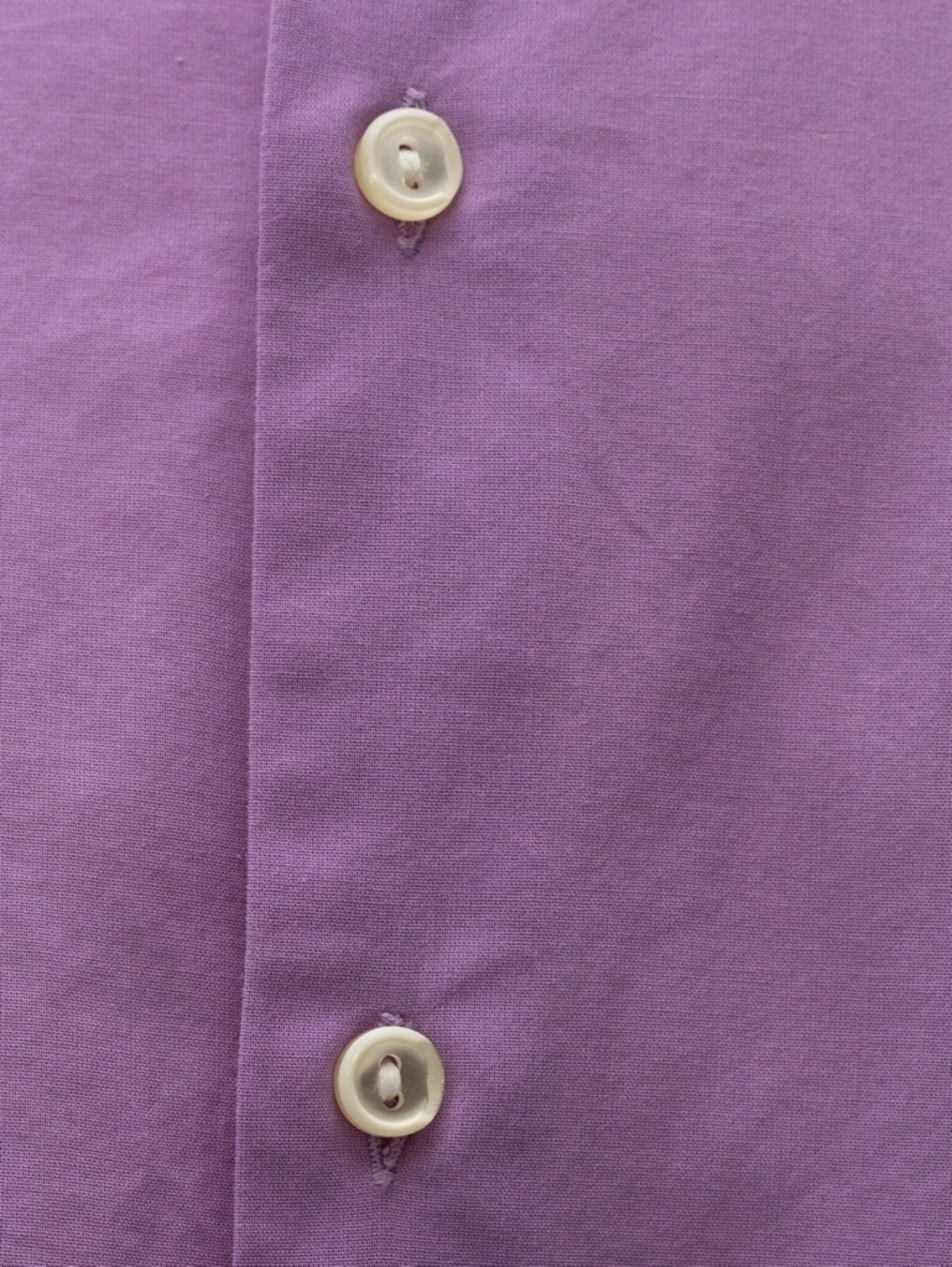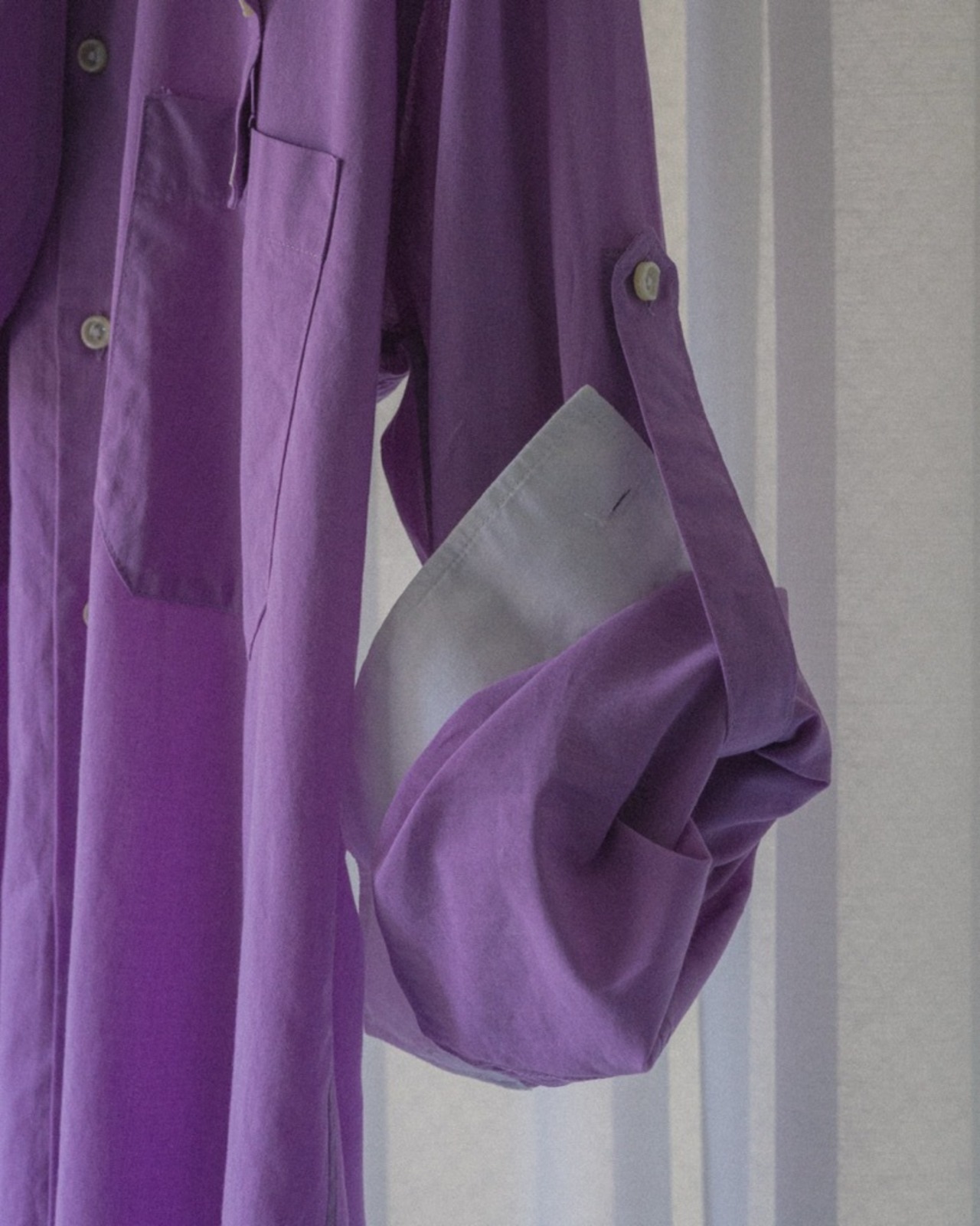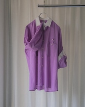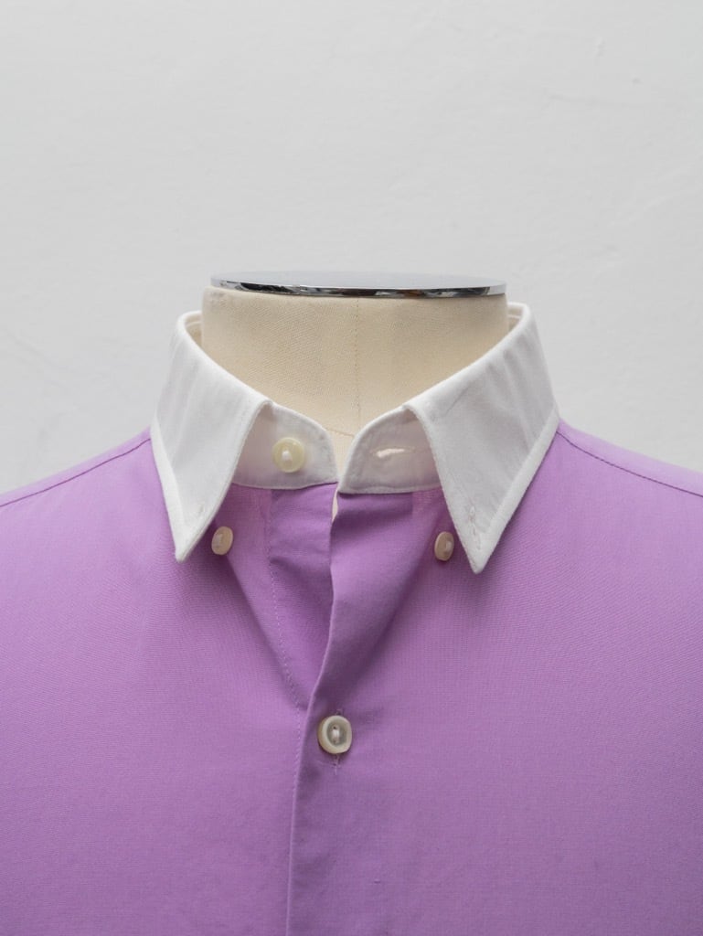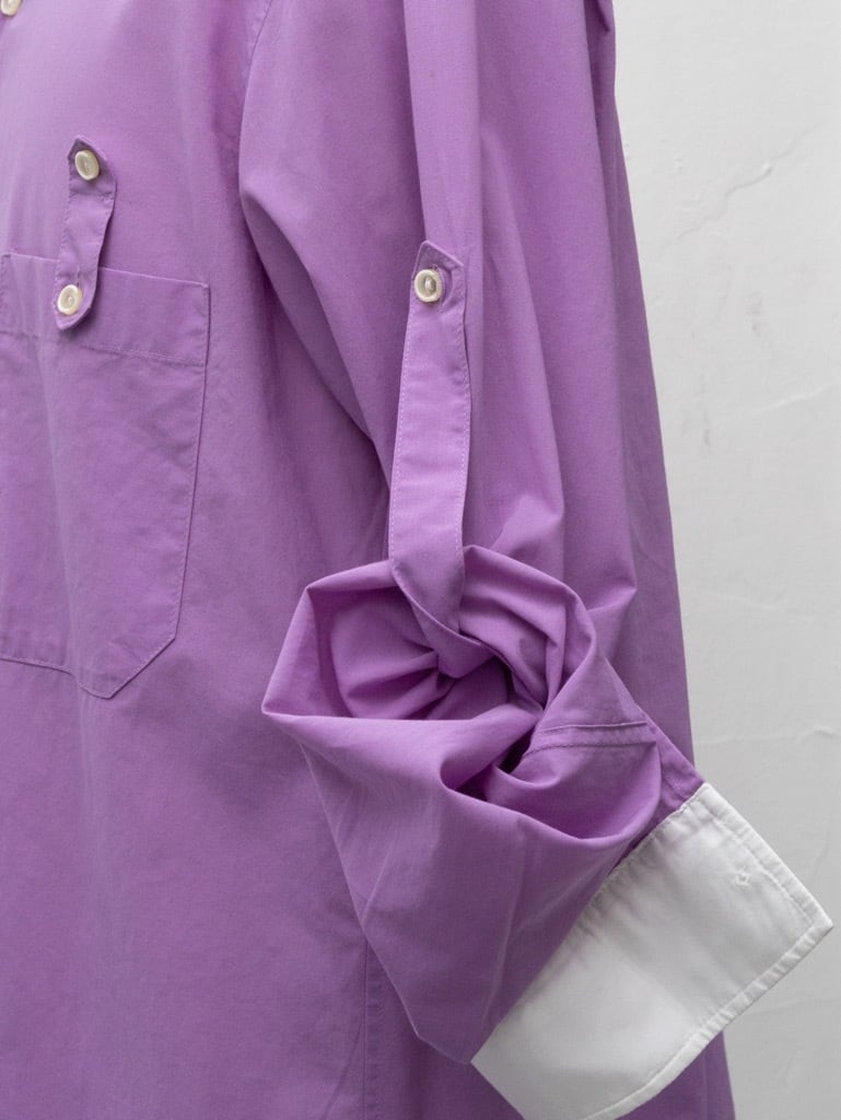 ややくすみのあるピンクパープルのボディと、白い襟のコントラストは、代表的なPIERRE CARDINのクリエイションの一つでもあるコスモコールを彷彿とさせる力強いカラーパレット。