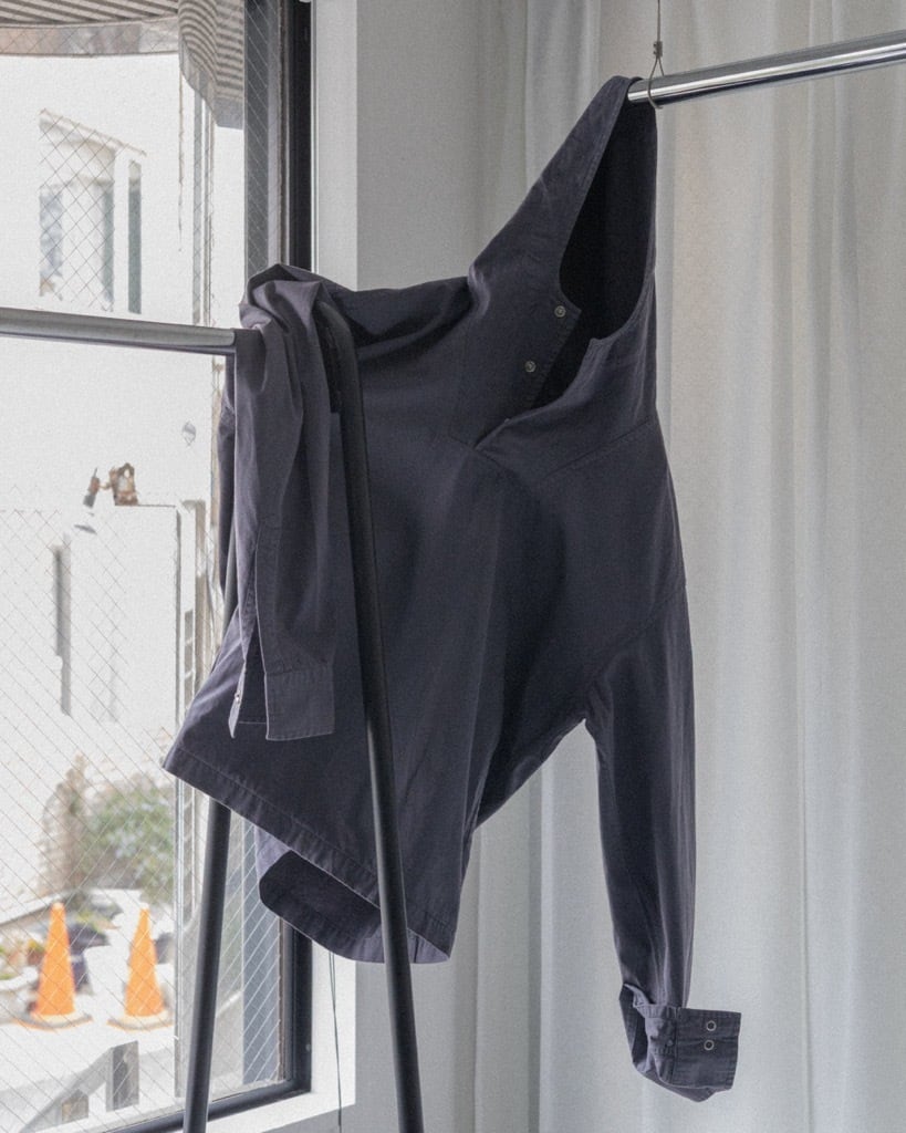袖と首周りはスナップボタンで留められるつくり。首周りはボタンを開くとシルバー色のボタンが映える。