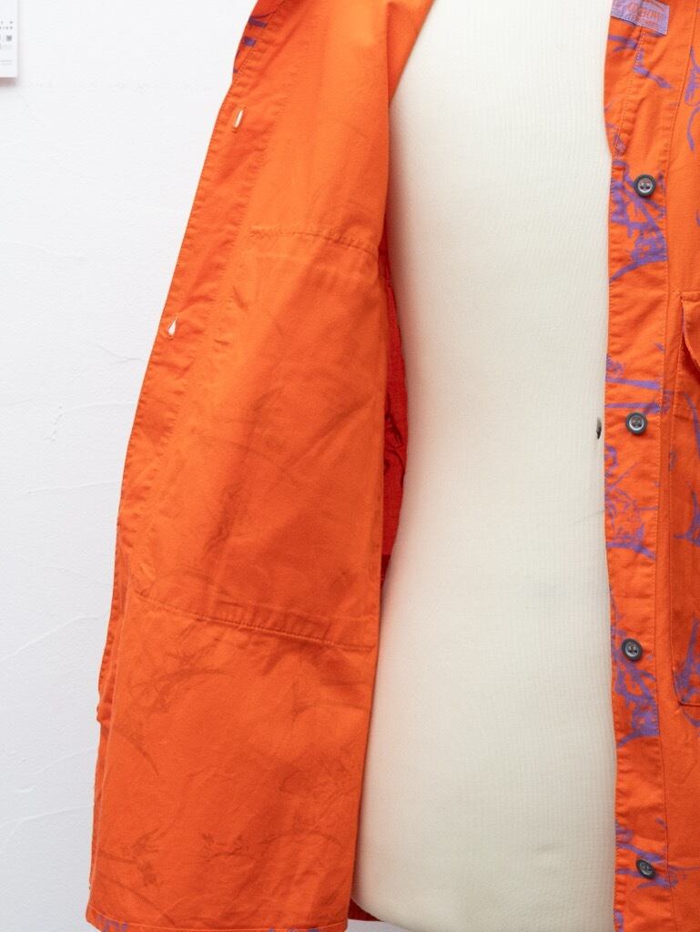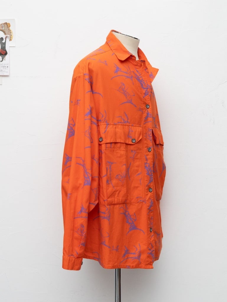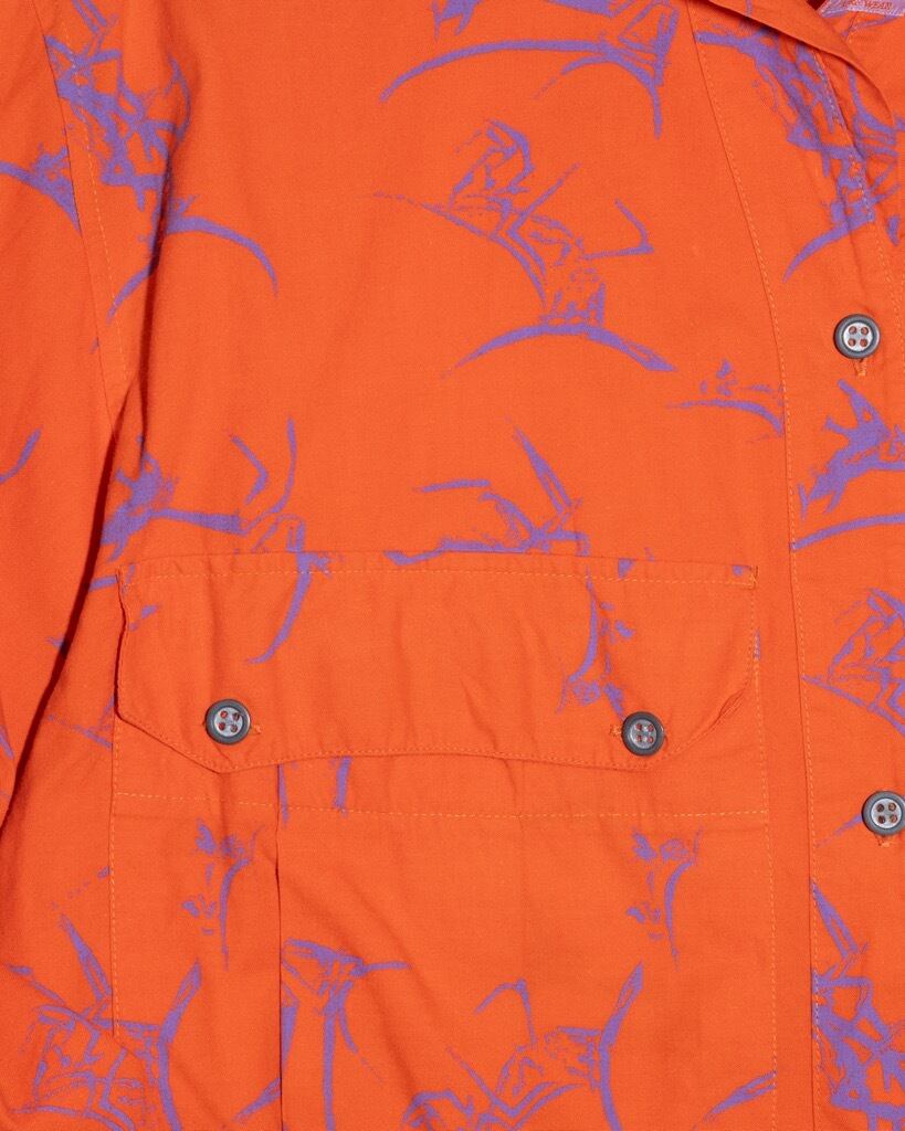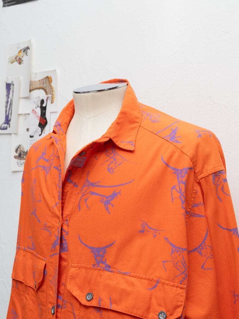 シャツともジャケットともいえるウエイトのコットン。オレンジのボディに、プリミティブアート調の牛のグラフィック。