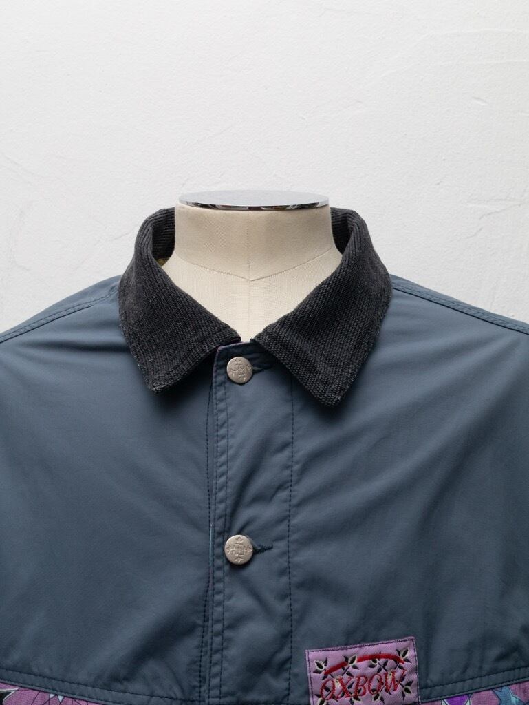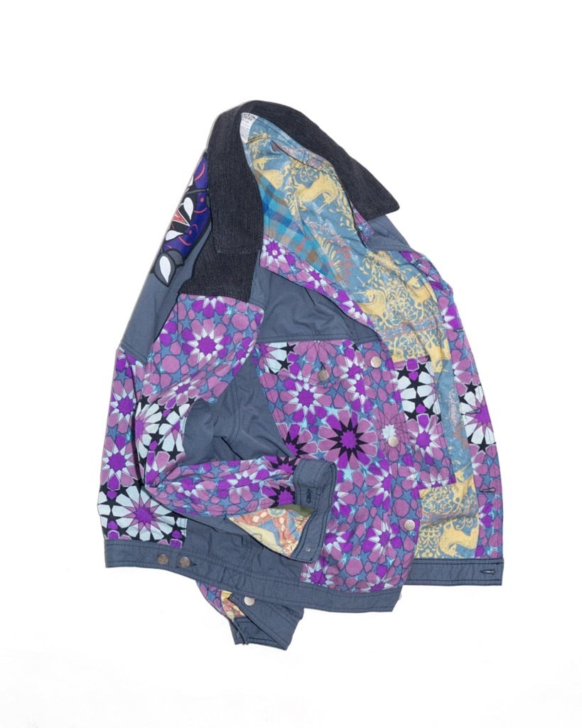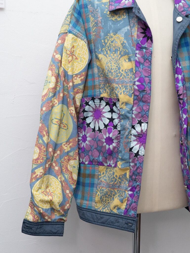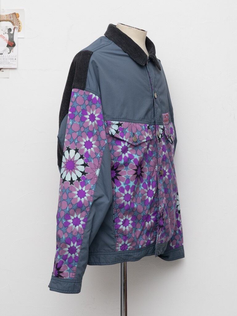 表地はナイロン生地に花のグラフィックプリント。裏はコットンの様々なグラフィックの生地をクレイジーパターンのように配置。
