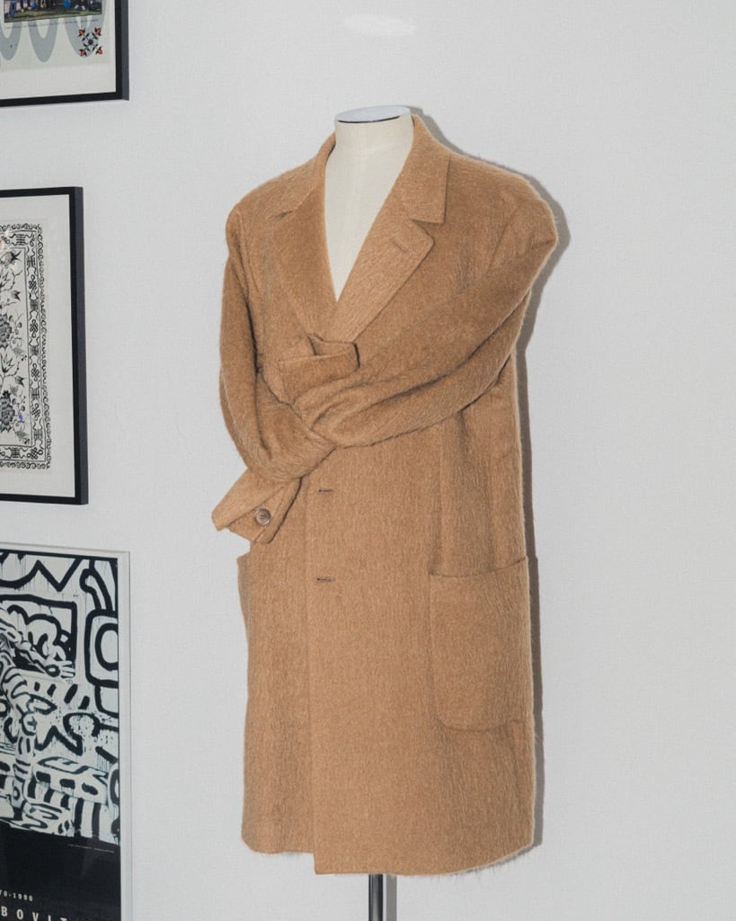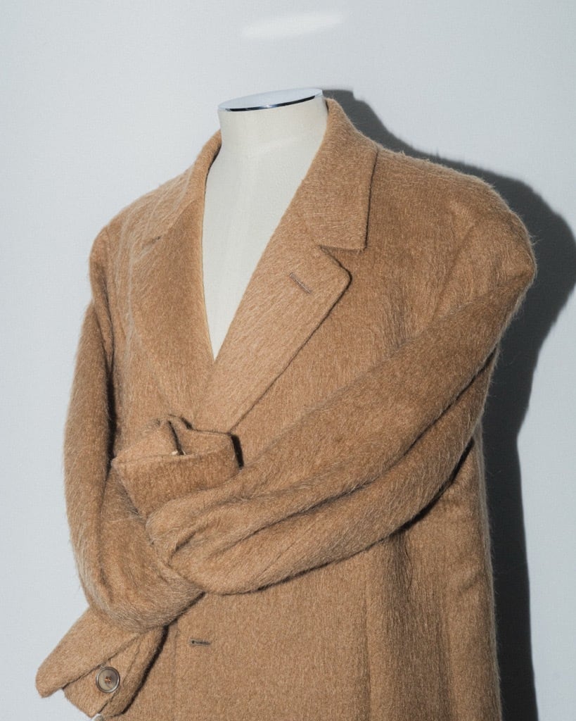 シングルブレスト、やや丸みがあり、やや大ぶりなラペルデザイン。フロントとポケットには飾りのハンドステッチ。
