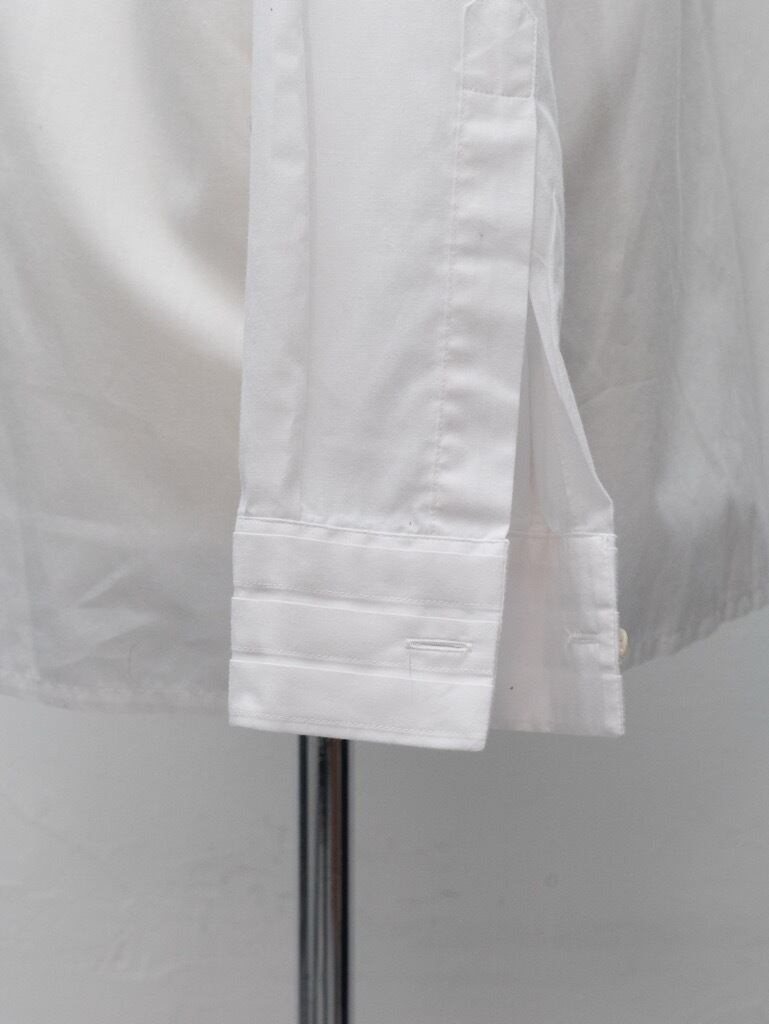 コットンポリの扱いやすくカジュアルタッチな生地に、フロントやカフスのプリーツやウィングカラーが外しになっている。